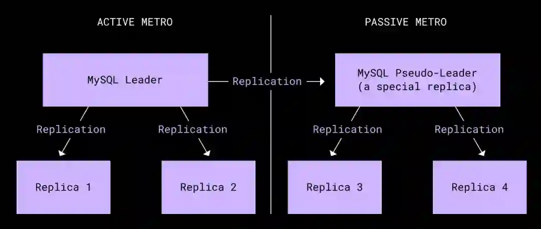 我们的元数据堆栈建立在两个大型分片 MySQL 部署之上。其一用内部数据库 Edgestore 承载着通用元数据,其二则负责承载文件系统元数据。集群中的每个分片由六台物理设备组成:两个核心区域,各自对应一台主机 primary 和两台副本 replica。