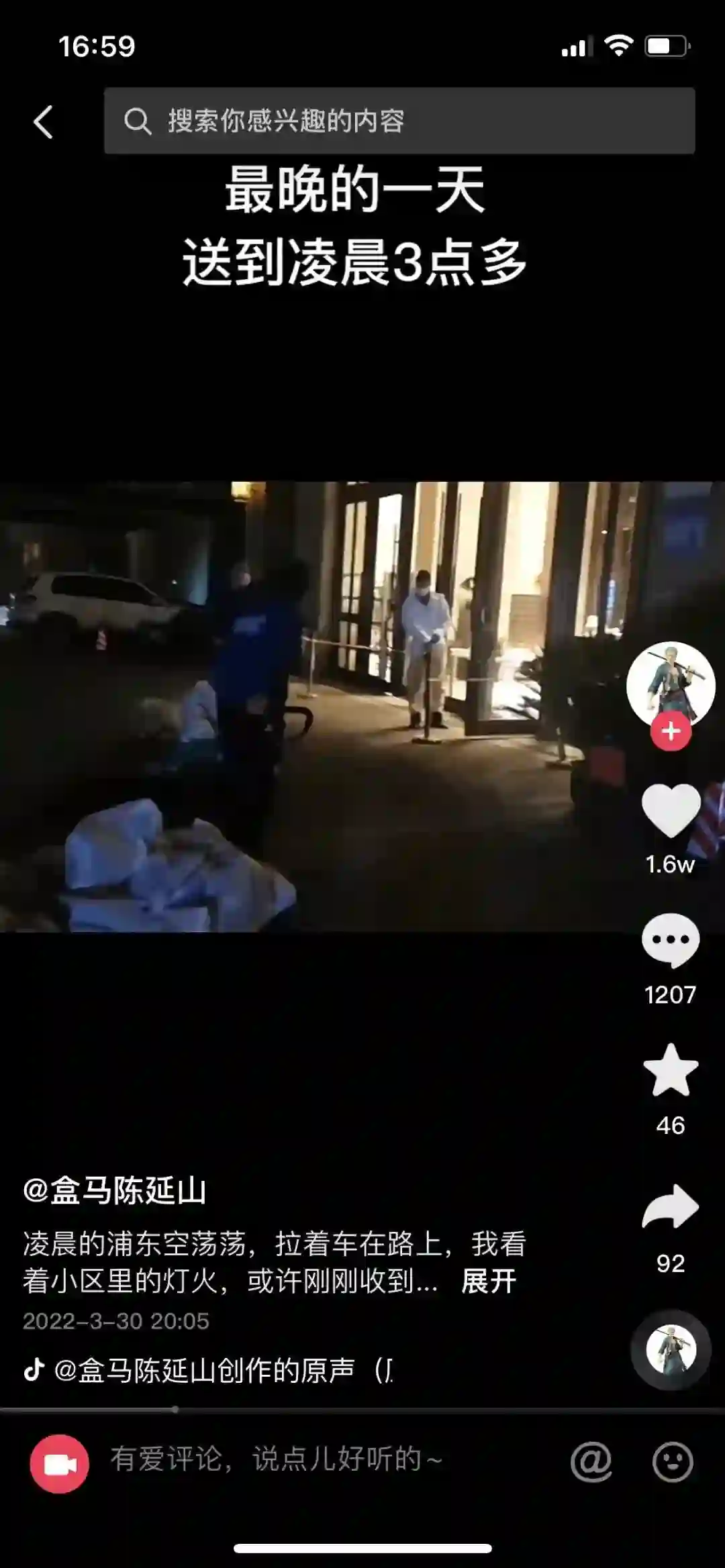 几天前有同事开玩笑互相打气,大家谈起一首叫做《孤勇者》的歌,我 3 月 29 日第一次听,挺喜欢那句『谁说站在光里的才算英雄』陈延山说,那天晚上,运送物资的路上,他拍了一段视频留念,突然一感念,在视频里说出(我们)像一个孤独的勇者。