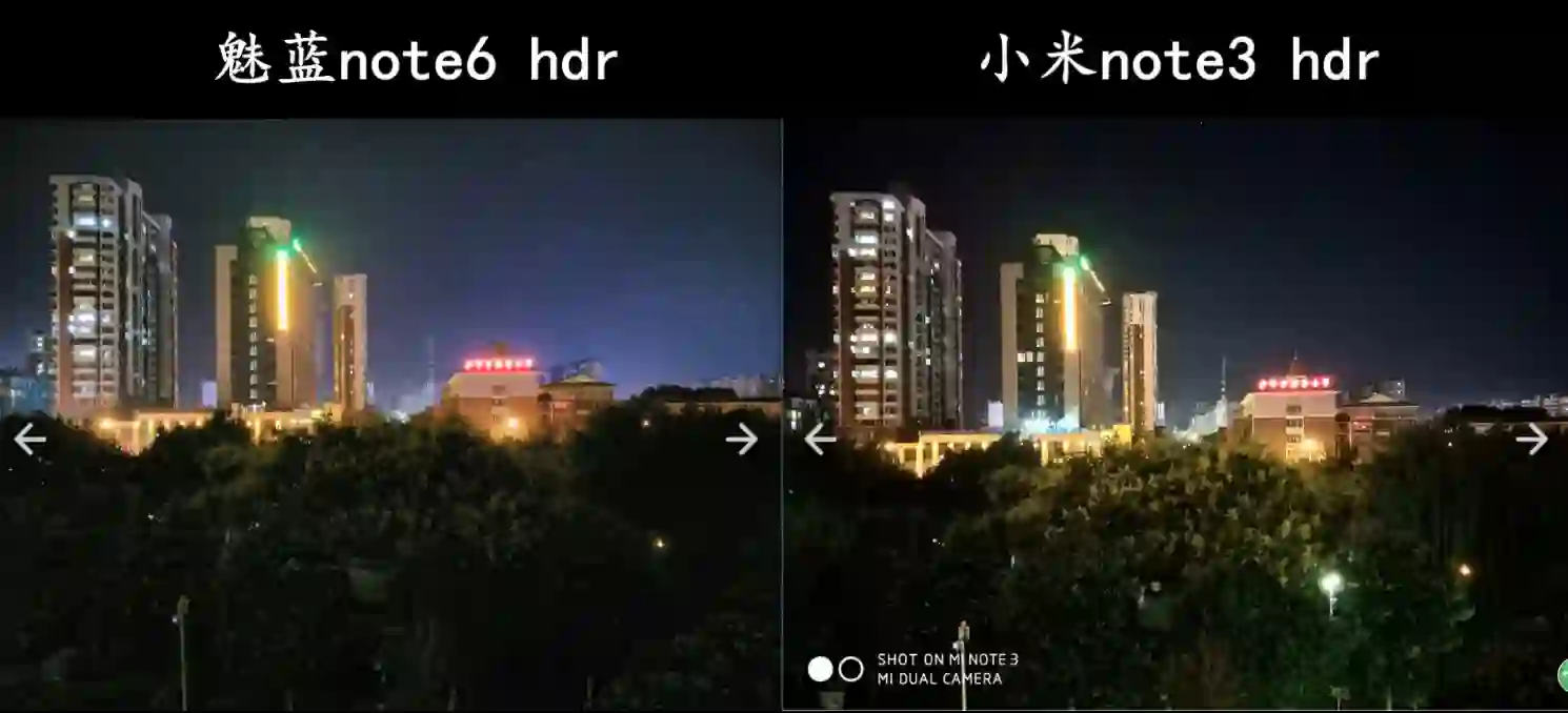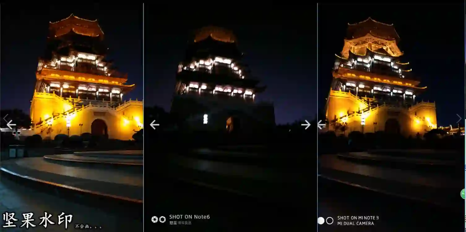 接着我们来看夜间宽容度。坚果的 HDR 颜色失真噪点恐怖,让我回忆起被努比亚 Z9 支配的恐惧。没想到活到 2017 年还能见到这效果。谷歌 HDR 就发挥了奇效,明暗控制的还挺不错的。魅蓝 Note 6 和小米 Note 3 的水平也都不咋地,魅蓝满世界噪点,小米明暗控制的还能看。再看看锤子,我的妈呀,过过过。