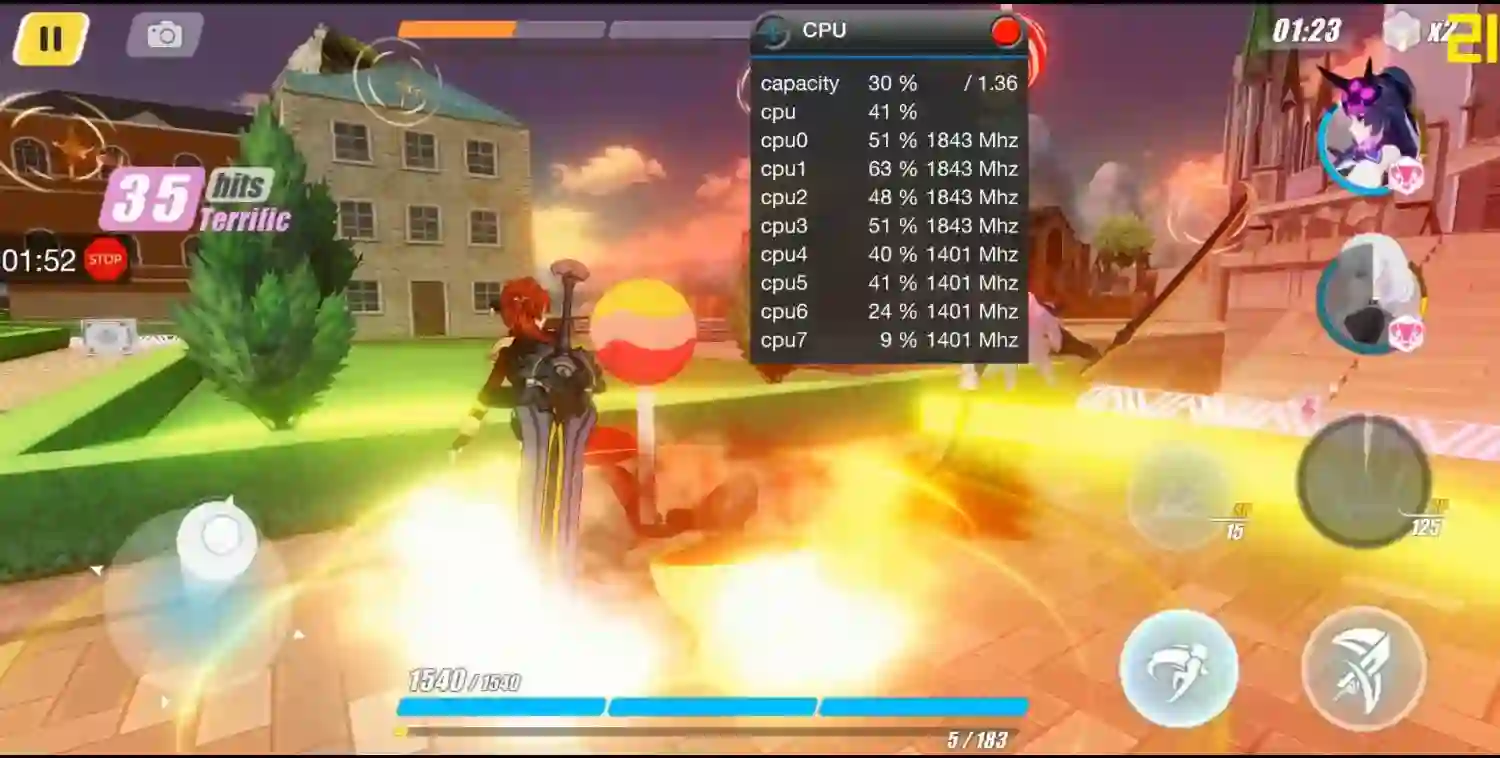 崩坏 3 显得相当吃力。帧数基本在 30 的及格线。而且多数时间是低于 30 帧的。甚至有些时候会到 24 帧。这样的时候就明显感到画面在卡顿。而且操作也不能流畅自如了。CPU 的调度其实也不算保守,温度也有 39 度。整个机身玻璃的温度非常平均,没有出现局部过热。