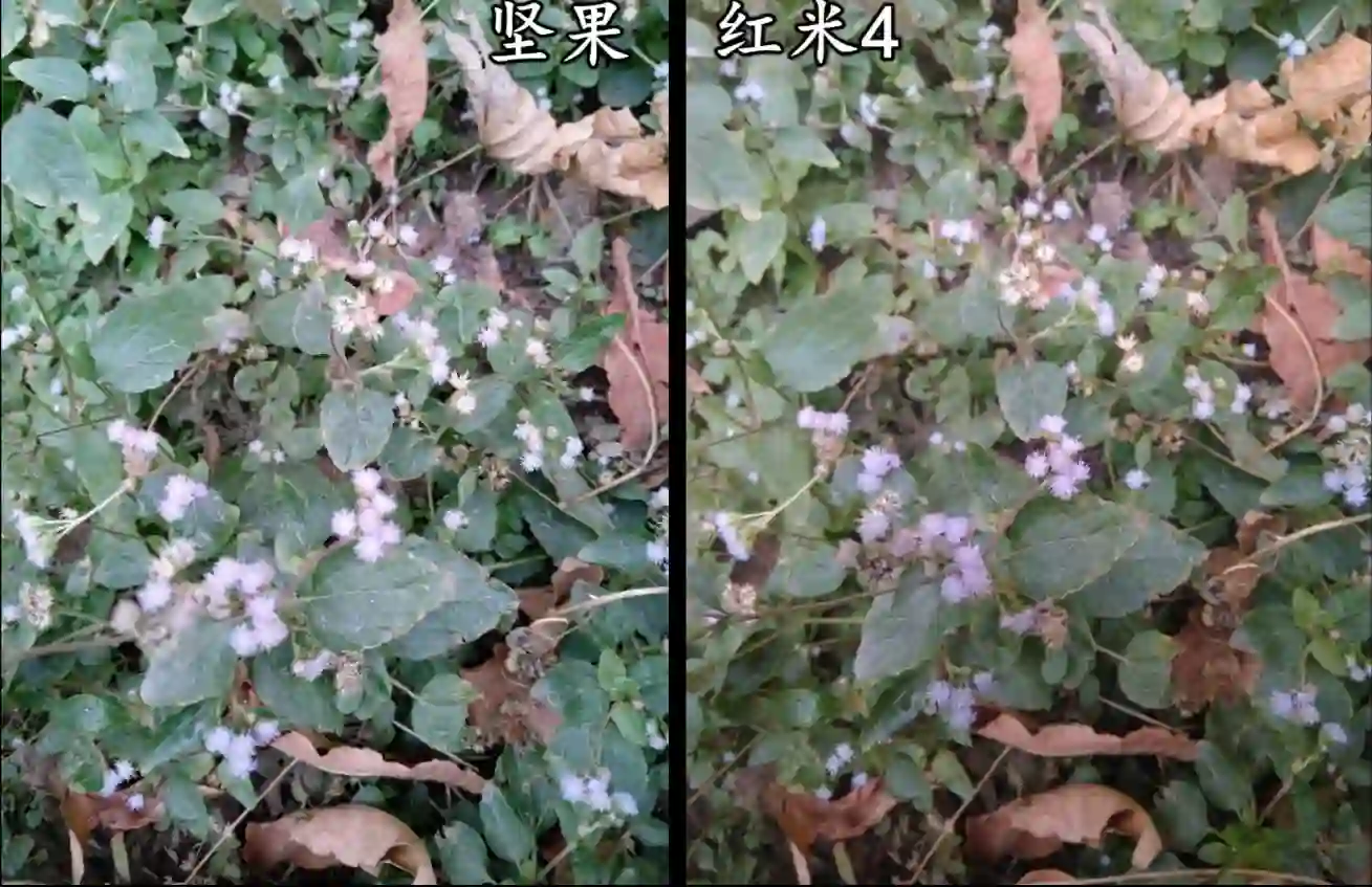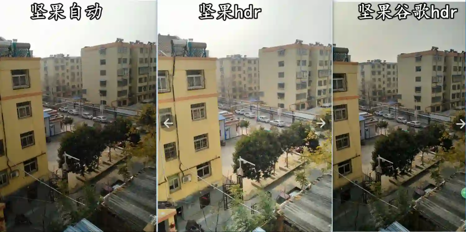 宽容度的方面,先看正午 12 点的白天,自动模式暗处偏暗。HDR 又亮的太假了。谷歌 HDR 的颜色也并不好。有点回天乏术的感觉。分别对比坚果和红米 4 的自动和 HDR,反而是红米 4 的 HDR 最终胜出。