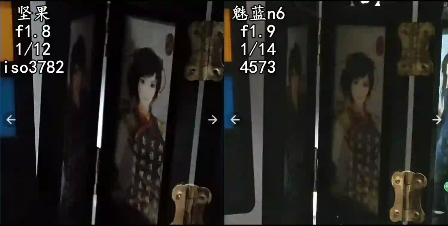 暗光条件下,坚果已经差成了锤子。字已经被涂抹的变形了。魅蓝的噪点也过于严重,好在没怎么涂抹。两个都已经是自动快门的极限。