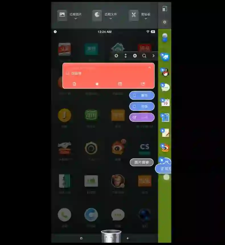 下滑只有通知,上滑是搜索,多任务键集成了快捷开关但是没有亮度。亮度是单独用音量键操作的。这个模拟来电还在。强迫症选项还是那么好用。拇指下拉就是单手模式,电路板高斯模糊在下面。