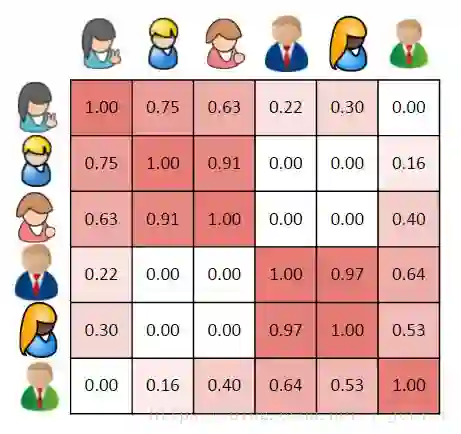 更一般的,我们可以计算出每个用户的相似性,并且在相似矩阵中表示它们。这是一个对称矩阵,单元格的背景颜色表明用户相似度的高低,更深的红色表示它们之间更相似。