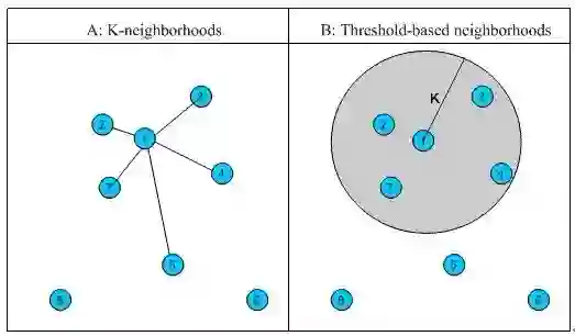 1、固定数量的邻居K-neighborhoods (或Fix-size neighborhoods),不论邻居的“远近”,只取最近的 K 个,作为其邻居,如下图A部分所示;