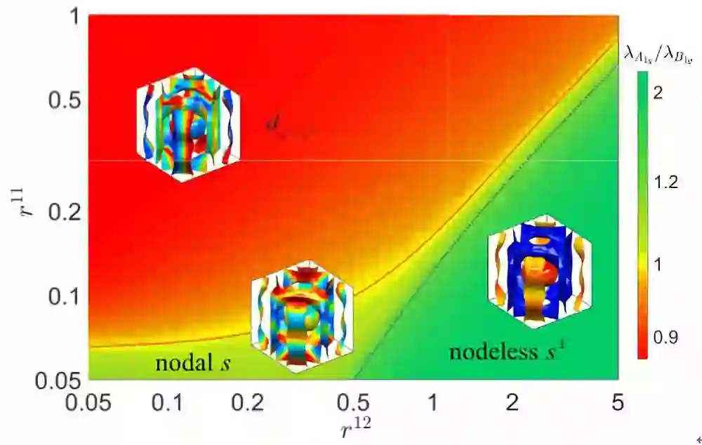 图3:常压下 CeCu2Si2 超导的理论相图,强带间散射可以导致无节点 s± 波解,图中d波区间的范围被高估。