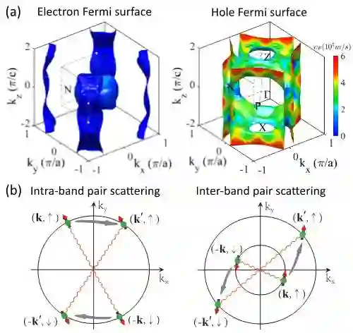 图1:(a) 常压下CeCu2Si2电子和空穴型费米面; (b) 带内和带间对散射的示意图。