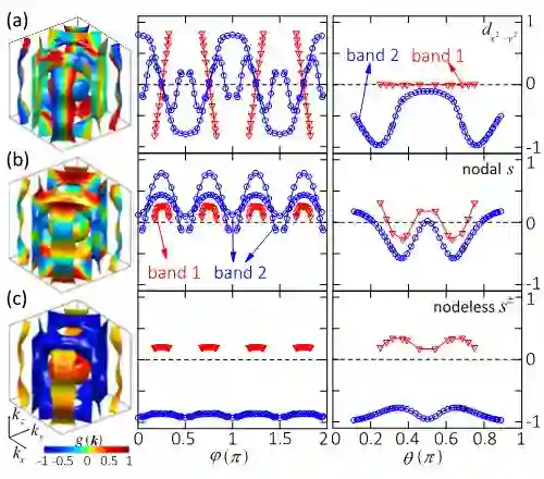 这些新的实验结果否定了传统的单带 d 波配对的简化图像,表明多个费米面的存在对超导配对具有重要的影响。但是基于第一性原理和随机相或微扰近似的计算只能得到 d 波或具有环形节点的 s 波解,与实验不符。为了解决这一问题,中国科学院物理研究所/北京凝聚态物理国家研究中心极端条件物理重点实验室 EX9 组的杨义峰研究员指导博士研究生李宇与刘敏(联合培养)对CeCu2Si2 超导配对及其能带结构进行了深入分析。他们同时考虑了体系中的电子和空穴型费米面,发现当两个费米面之间存在较强的库珀对散射时,可以得到无节点的 s± 波解,其能隙比值也与实验相符,首次为解释实验提供了可能的理论基础。新理论还认为先前计算所得到的 d 波和环形节点 s 波解分别来自于电子和空穴型费米面本身,在压力下,电子型费米面消失,超导会从无节点 s±波过渡到仅由空穴费米面诱导的有节点 s 波配对,从而解释高压下观测到的新超导相。这一结果表明在实际重费米子材料中,多个费米面的存在和费米面之间的对散射会导致完全不同于传统单带图像的全新结果;而是否存在较强的面间对散射,则很大程度上依赖于每个费米面的轨道特征,以及与之相关的轨道涨落。现有第一性原理计算过高估计了电子型费米面的嵌套和由此导致的 d 波超导解,未来需要更好地处理强关联效应对费米面和配对作用(即量子临界涨落)的影响。