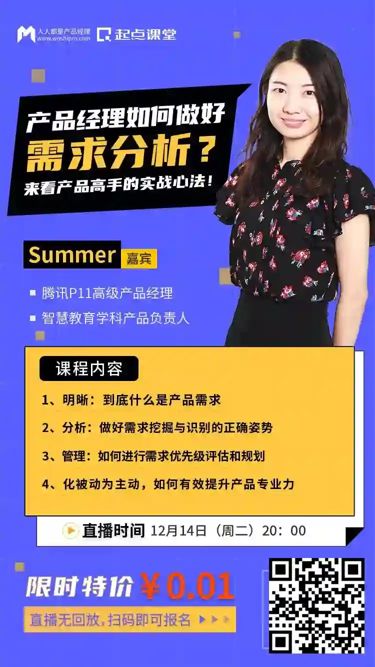 本次课程特别邀请了腾讯P11高级产品经理、智慧教育学科产品负责人@Summer老师授课。