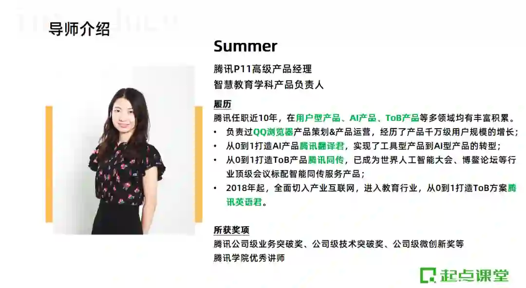Summer老师在腾讯任职近10年,在用户型产品、AI产品、ToB产品等多领域均有丰富积累。