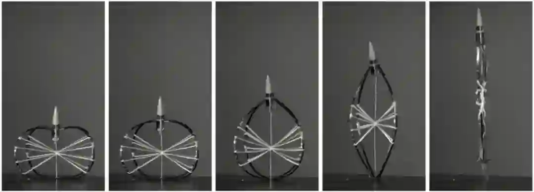 ,对于这类机器人来说还是比较重的。它几乎完全由充当弹簧的碳纤维弓和蓄力的橡皮筋制成。机器人的中心包括一个电机、电池和一个连接机器人顶部与底部的绳索的闩锁装置。