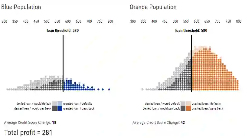 常见的一个公平标准,人数均等,要求银行以同样的比例向两个群体发放贷款,同时银行也可以继续实现利润最大化。另一个标准,即机会均等,两个群体之间可以偿还贷款的人,银行要提供相同的放贷比率。