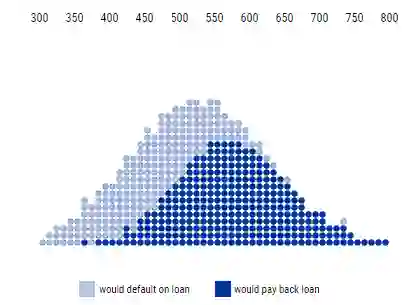 上图中,最上面的数字表示信用评分,评分越高表示偿还能力越强。每一圆圈表示一个人,深蓝色的圆圈表示将会偿还贷款的人,浅蓝色的圆圈表示将会拖欠贷款的人。