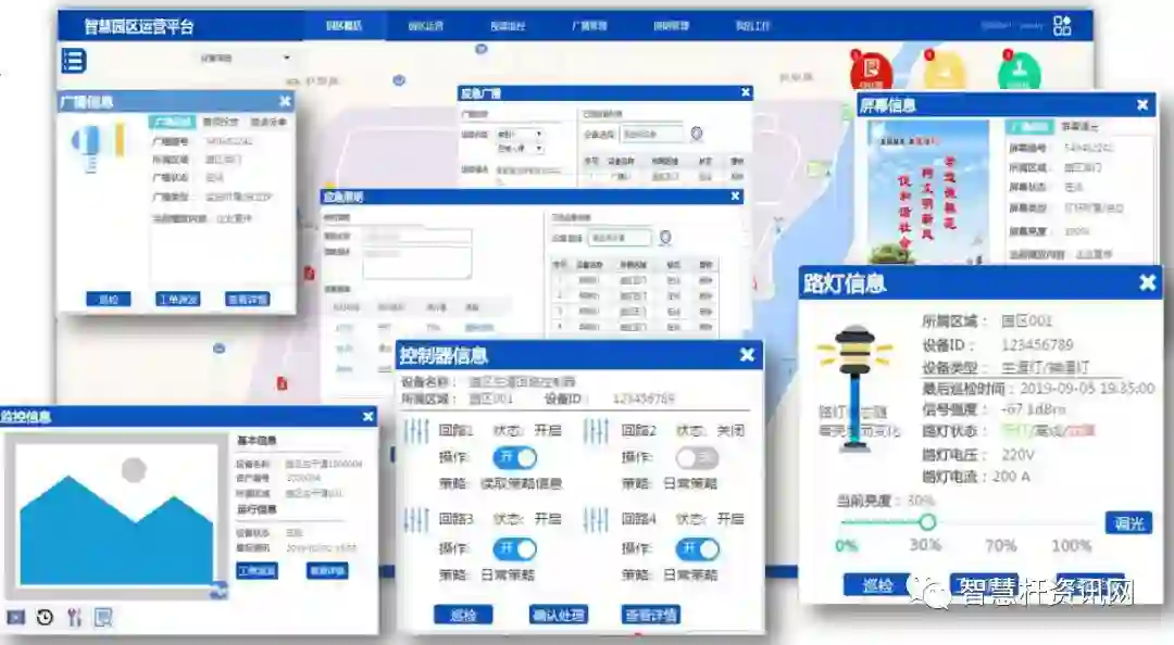 平台基于智慧杆搭载的智能终端硬件,实现对园区、景区等区域的综合管控,通过智能化手段实现资产之间的信息互通和共享,将分散的各应用系统,统一到可视化平台,通过多系统的联动交互,以及事部件的闭环处置,实现智慧管理。