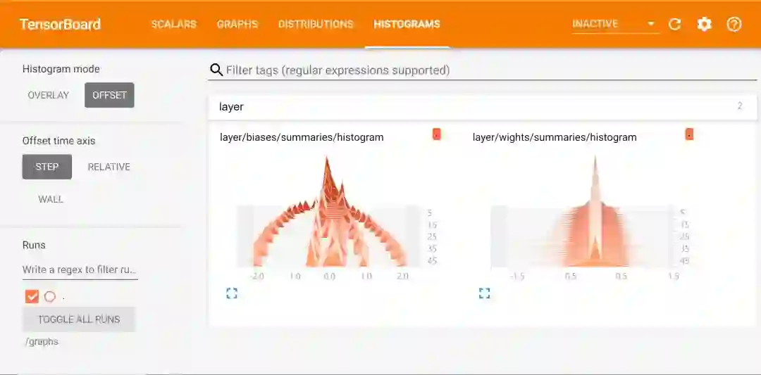 Histogram Dashboard:显示张量的统计分布如何随时间变化