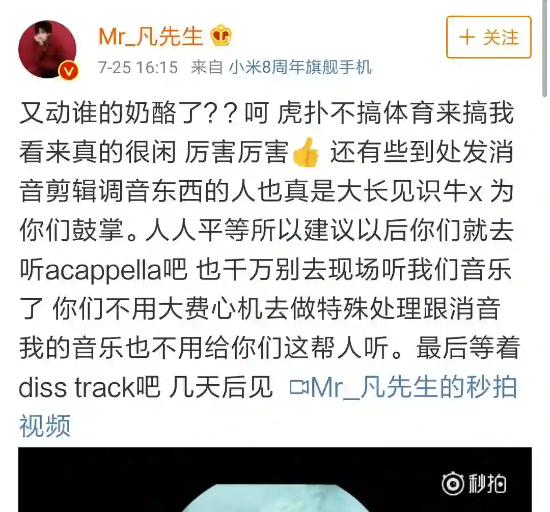 十几分钟后,吴亦凡甚至亲自下场,怒发微博:“又动谁的奶酪了??呵,虎扑不搞体育来搞我,看来真的很闲,厉害,厉害……”他对虎扑隔空喊话,几天后等着diss track(反击的说唱歌曲)。末了,他还不忘附上自己新专辑的MV。