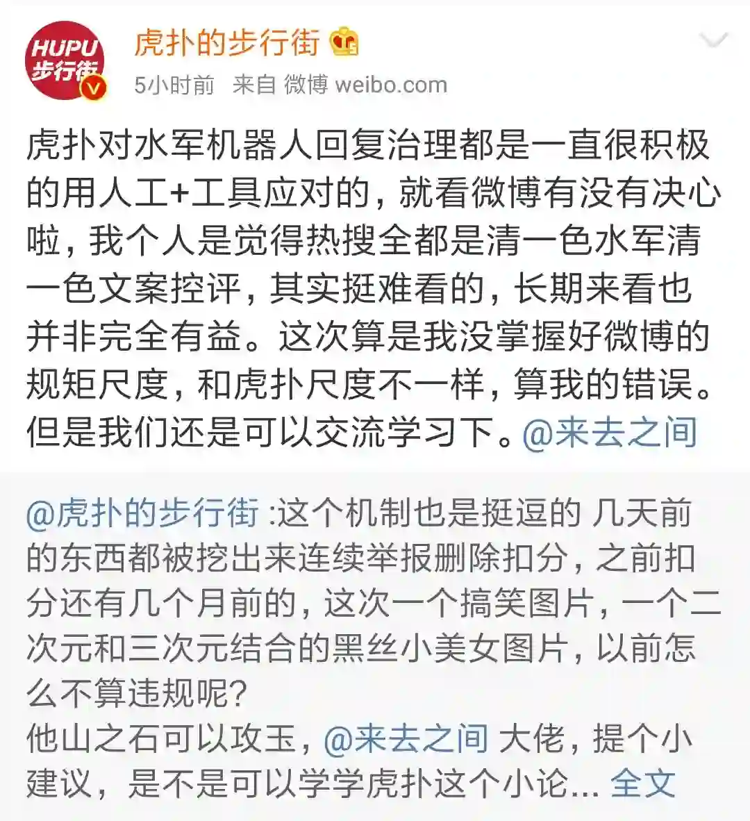 今天中午,@虎扑的步行街 质疑微博的投诉机制,还@来去之间 ,让它“学习一个”。可惜并没有得到回应。1小时后,官博服软了,不太情愿地表示“这次算我没掌握好微博的规矩尺度……”