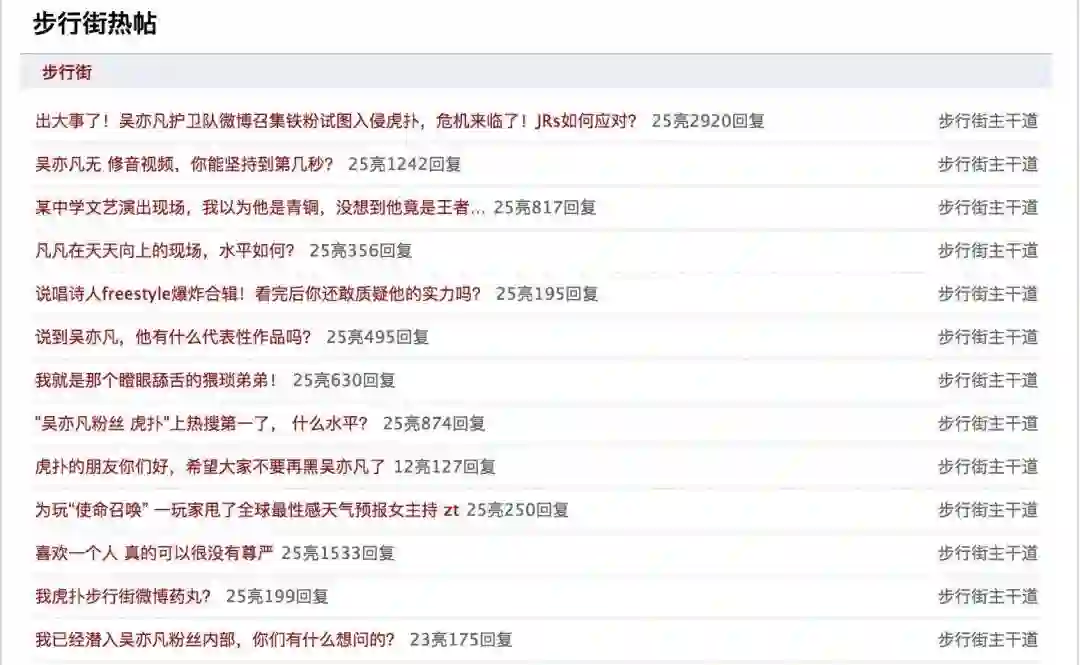 在《虎扑遇上吴亦凡》的文章下,作者木村拓周写道:“说白了,饭圈外的人,有哪一个真的喜欢、欣赏饭圈的组织模式和行为模式呢?但带着一股青春期男生特有的无畏,步行街和JRs 站稳了这个立场。”