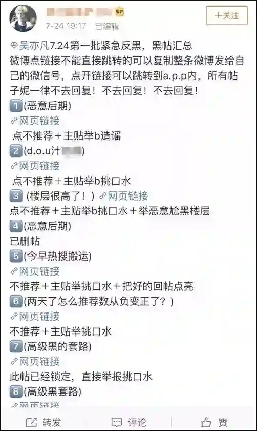 当天晚上,一名微博用户将“虎扑上凡凡的黑料”、举报原因与举报方法整理出了一条长微博,发到“吴亦凡”的超级话题下,呼吁“梅格妮”们集体举报。