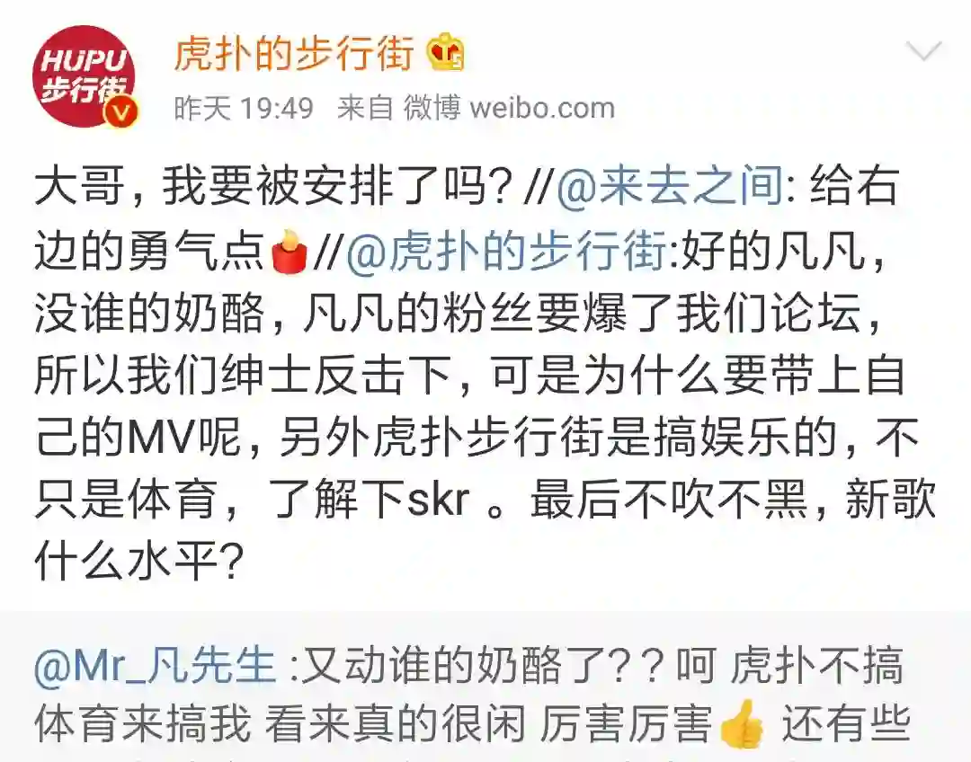 @虎扑的步行街 战斗力不减,立刻转发微博、反唇相讥:“凡凡的粉丝爆了我们的论坛,我们绅士反击下,可是(吴亦凡)为什么要带上自己的MV呢?”话里话外质疑吴亦凡水平不行,还喜欢炒作。