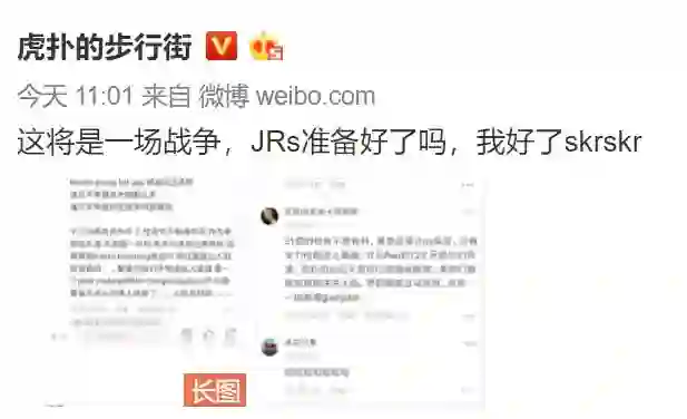 官博也毫不示弱。7月25日中午,微博@虎扑的步行街 发出了挑衅:“这将是一场战争,JRs准备好了吗,我好了skrskr”。