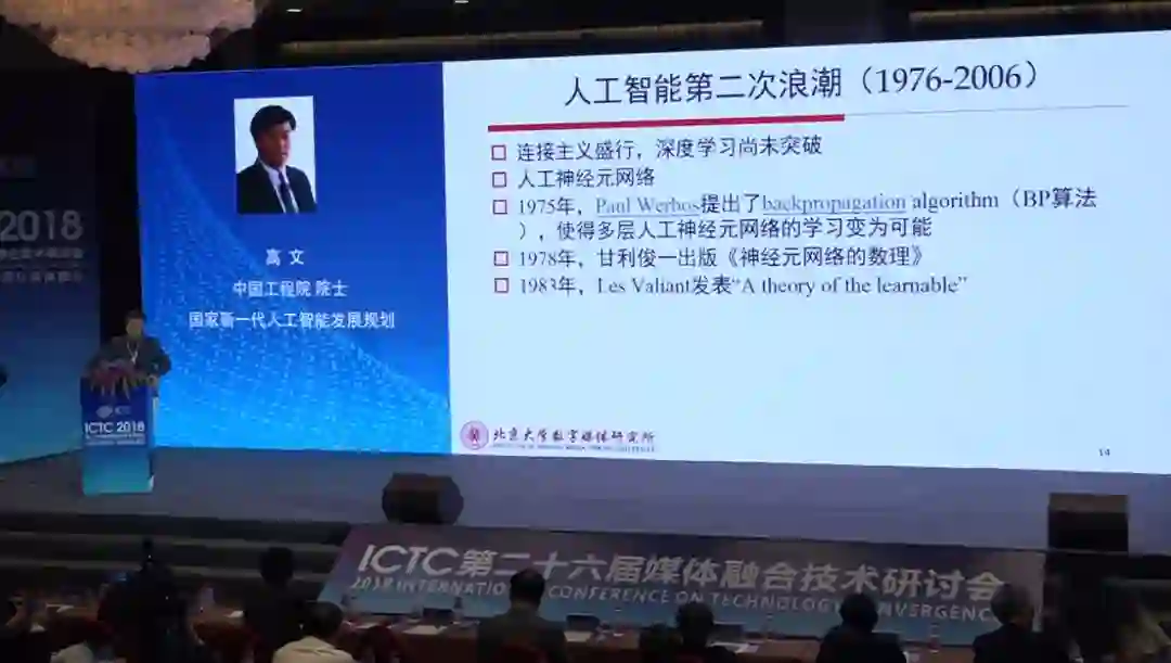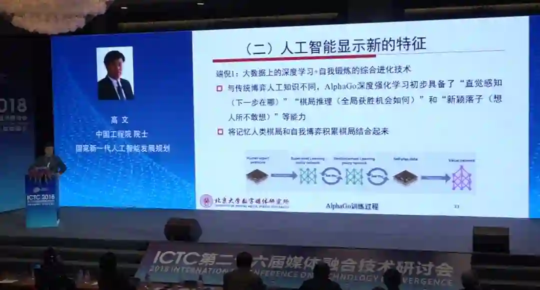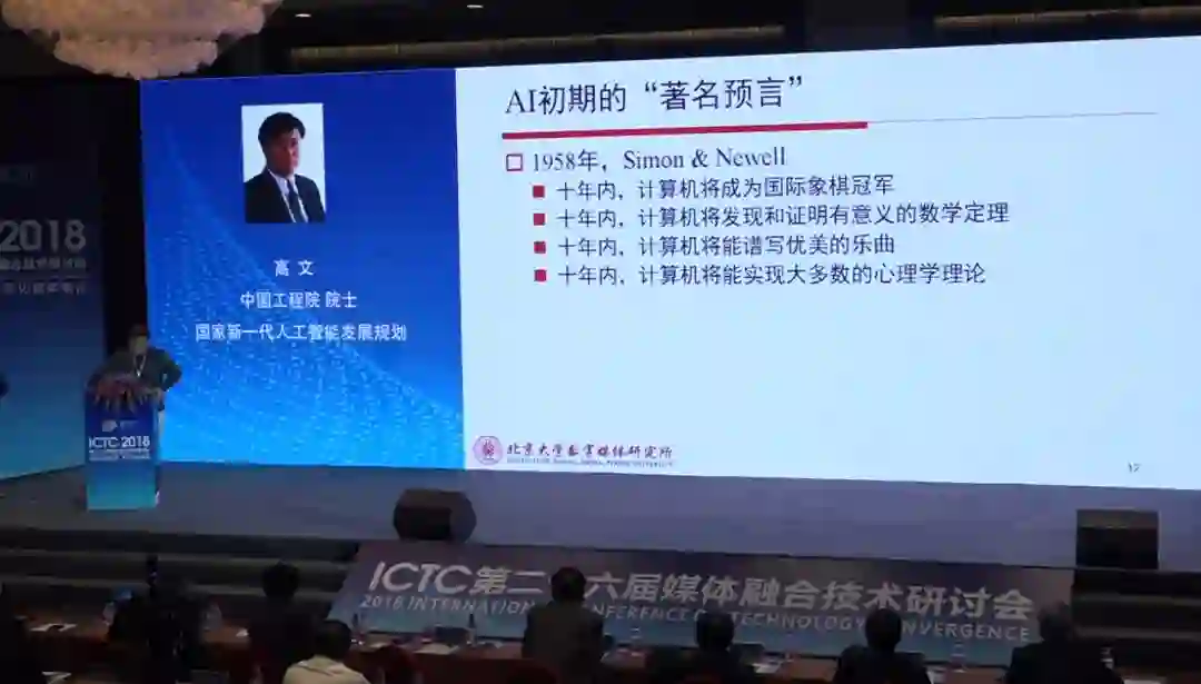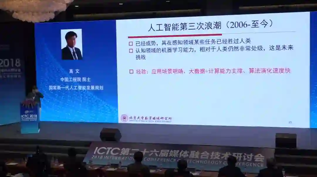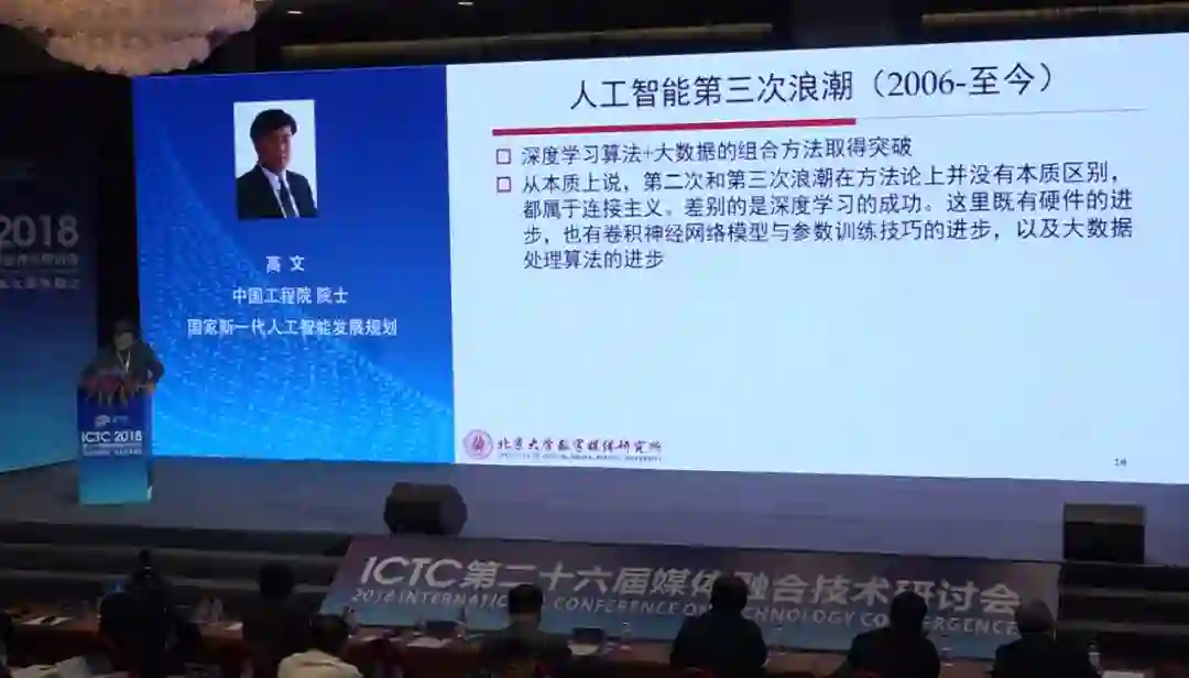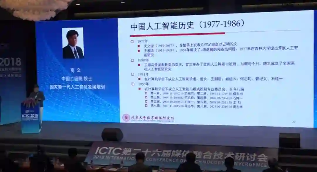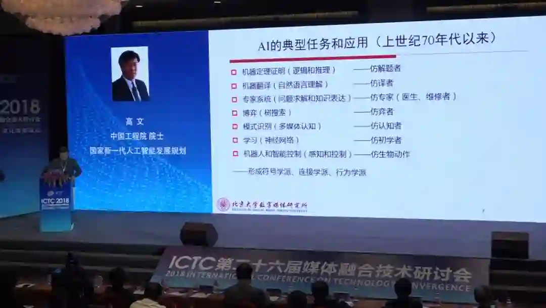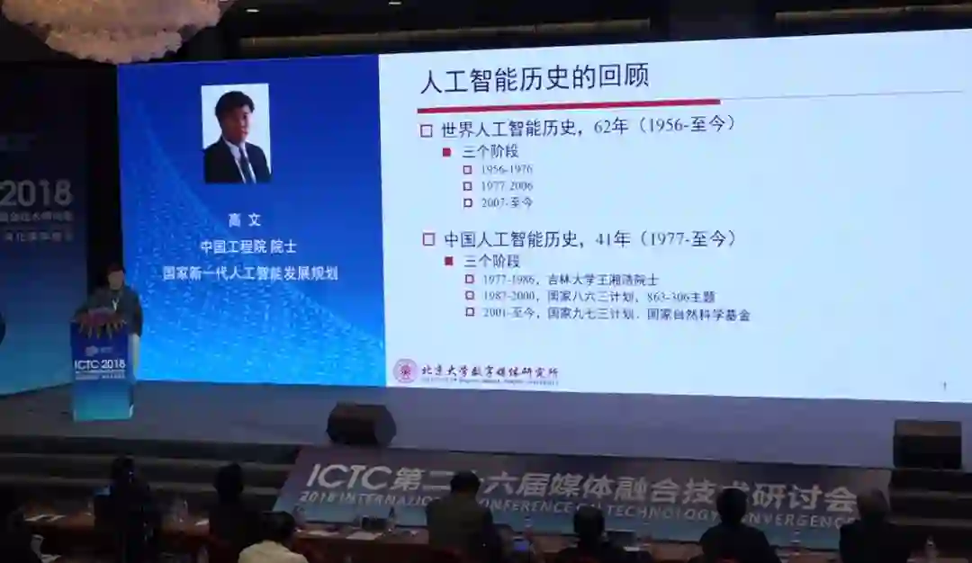 在会上,中国工程院院士高文院士发表演讲,人工智能的历史自1956年开始,至今已经62年。当时在Dartmouth大学进行了为期10个月的研讨,10位人工智能学者共同首次确定了人工智能的概念,让机器能像人类一样认知、思考并学习,这是首次采用计算机模拟人的智能。