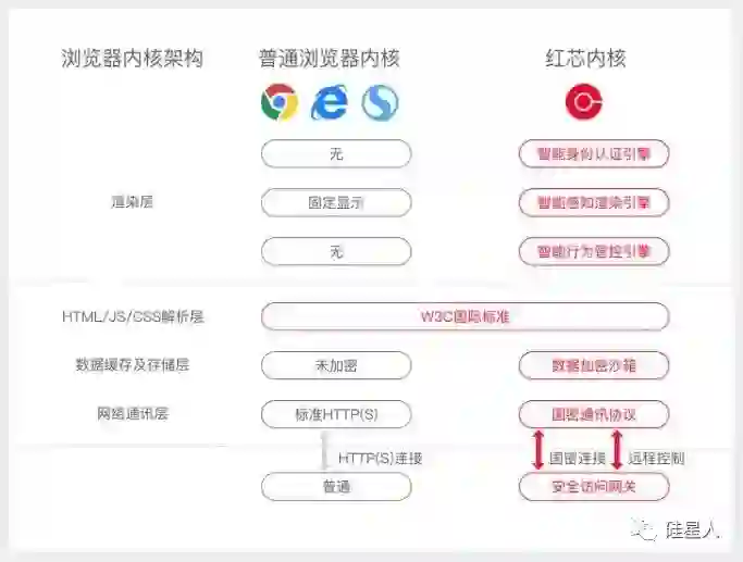 通过这张图我们可以清晰地看到,国外的产品简直弱爆了:这些浏览器甭管有多少开发者维护,技术有多先进,用户量有多大,该有的还是没有;而咱们的红芯呢?拥有智能的认证引擎、渲染引擎、管控引擎,而且还有强大的“国密通讯协议”,支持统一管控、远程控制,简直不能再强大好吗?