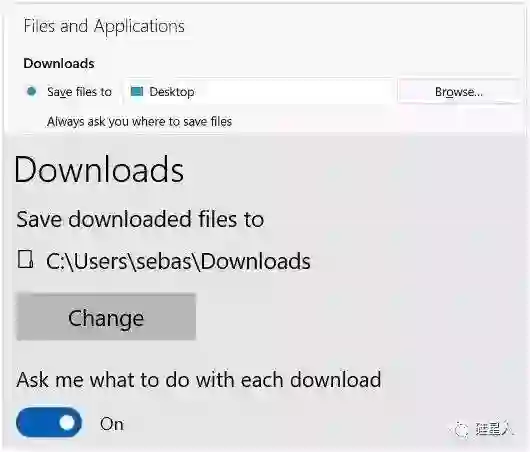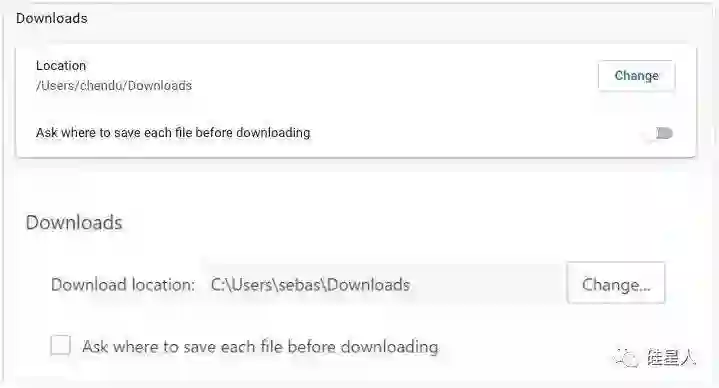 不对,等等:我发现,除了部分设置的顺序安排不一致,红芯的设置选项的文案跟 Chrome 基本都是相同的。比如下载文件的路径和是否每次询问路径,截图上面是红芯,下面是 Chrome: