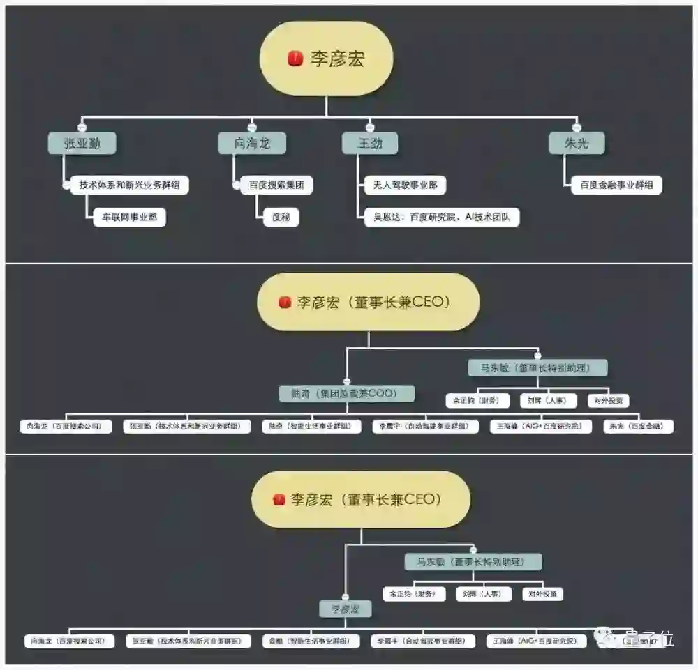 自动驾驶事业群组(IDG),转向张亚勤汇报,再由这位百度总裁向李彦宏汇报;智能生活事业群组(SLG),升任度秘事业部总经理景鲲为SLG总经理,直接向李彦宏汇报。