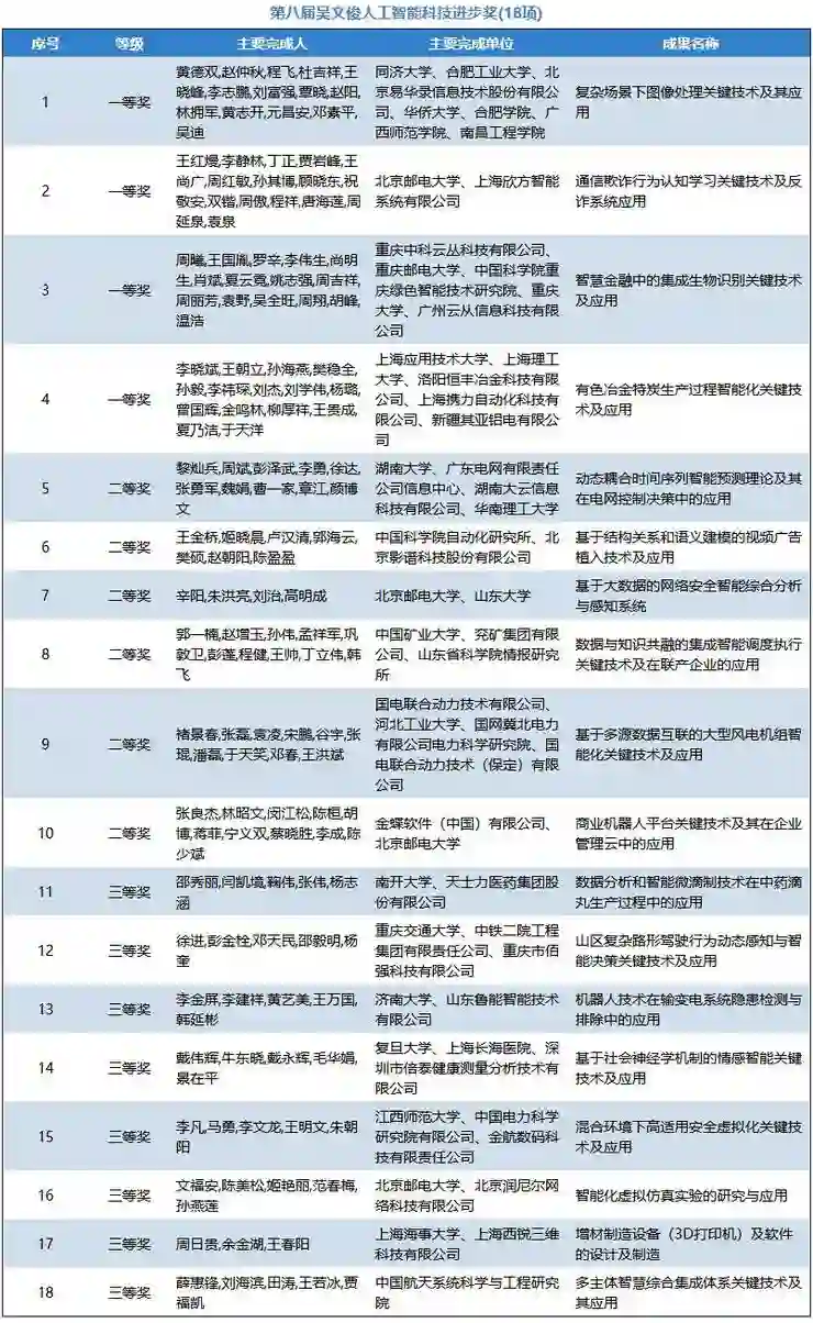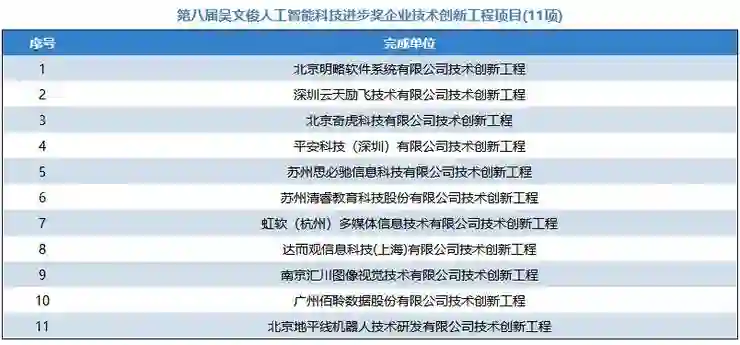 北京明略软件系统有限公司技术创新工程、深圳云天励飞技术有限公司技术创新工程、北京奇虎科技有限公司技术创新工程、平安科技(深圳)有限公司技术创新工程、苏州思必驰信息科技有限公司技术创新工程、苏州清睿教育科技股份有限公司技术创新工程、虹软(杭州)多媒体信息技术有限公司技术创新工程、达而观信息科技(上海)有限公司技术创新工程、南京汇川图像视觉技术有限公司技术创新工程、广州佰聆数据股份有限公司技术创新工程、北京地平线机器人技术研发有限公司技术创新工程等分别获得吴文俊人工智能科技进步奖(企业技术创新工程项目)。