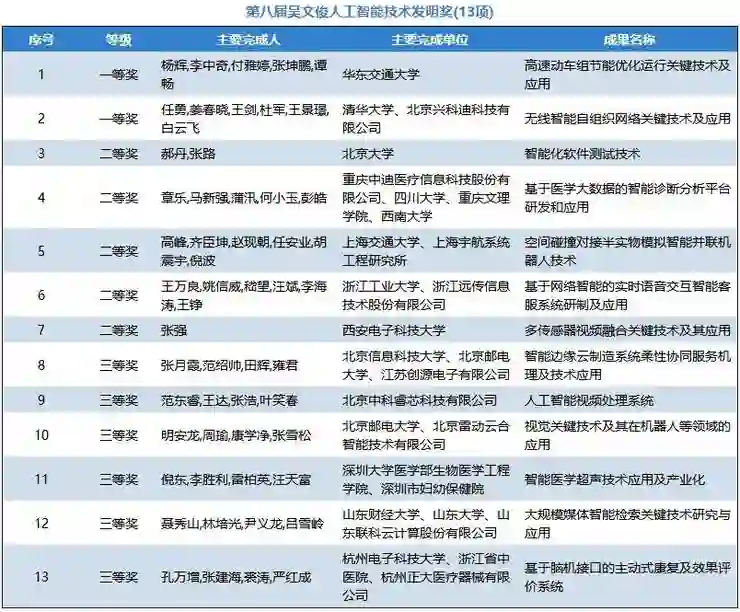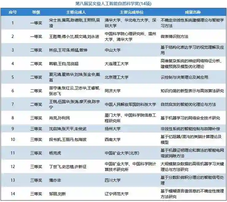 华东交通大学杨辉、清华大学任勇等完成的项目成果分别获得吴文俊人工智能技术发明奖一等奖。