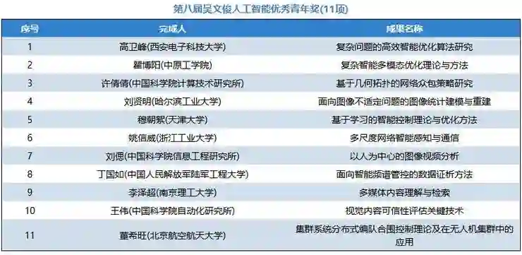 西安电子科技大学高卫峰、中原工学院瞿博阳、中国科学院计算技术研究所许倩倩、哈尔滨工业大学刘贤明、天津大学穆朝絮、浙江工业大学姚信威、中国科学院信息工程研究所刘偲、中国人民解放军陆军工程大学丁国如、南京理工大学李泽超、中国科学院自动化研究所王伟、北京航空航天大学董希旺分别获得吴文俊人工智能优秀青年奖。