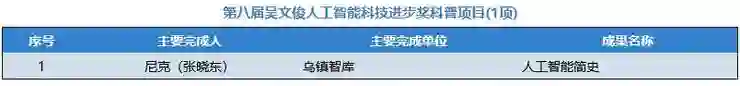 乌镇智库尼克(张晓东)获吴文俊人工智能科技进步奖(科普项目)。