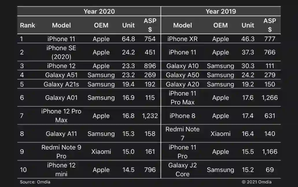 结果,仿佛来自上个十年的 iPhone SE 2 成为了一匹黑马,成为 2020 年第二畅销的手机,仅次于 iPhone 11,小胜首尝 5G 的 iPhone 12。