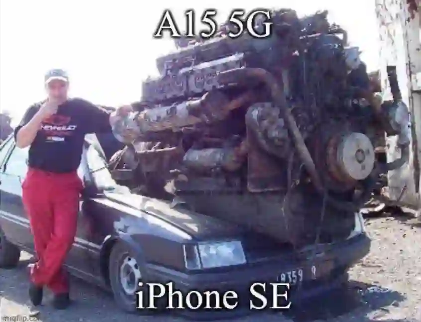 但除了这颗芯片与 5G 网络,iPhone SE 3 在其他方面几乎没有升级,还是 iPhone 8 的祖传模具,显得格格不入。更不用说,它还史无前例地涨价了,美国的起步价突破 400 美元关口来到 429 美元,国行版本对应涨价 200,卖到 3499 元。总的来说,iPhone SE 3 给人的感觉就像这张梗图。
