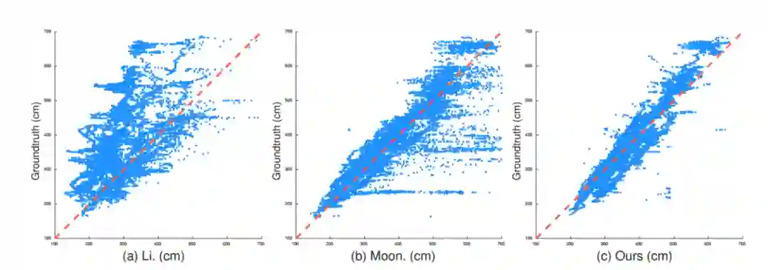 另外,我们对不同可选的深度估计方法进行了对比。第一种,回归全图的深度[1],如图第一列;第二种,根据检测框的尺寸回归人体深度[2],如图第二列。散点图的横坐标为人体深度估计值,纵坐标为实际值,散点越靠近 x=y 直线说明回归的深度越准确。可以看出,我们提出的方法(Root Depth Map)具有更好的深度一致性和泛化能力。