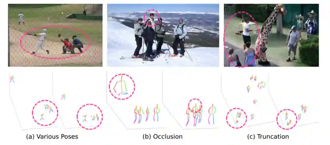 为了体现单步自底向上网络相对于自顶向下网络[2]的优势,我们进行了定性分析。图中左边为自顶向下网络的结果,可见自顶向下的方法会受到姿态变化、人体遮挡、人体截断的影响,而我们提出的自底向上的方法可以利用全局信息缓解这个问题。