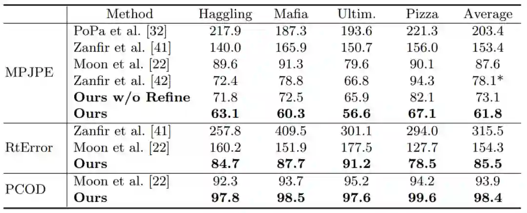 我们提出的方法在 CMU Panoptic 和 MuPoTS-3D 多人三维人体姿态估计数据集上均达到 SOTA。