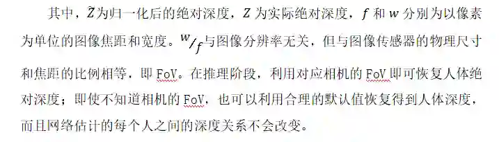 对于同一个深度下的同一个人,具有不同内参(FoV, field of view)的相机会得到不同的二维图像,这对建立二维信息(如人体尺寸)和绝对深度之间的映射关系是不利的,所以需要对输入网络的深度利用 FoV 进行归一化: