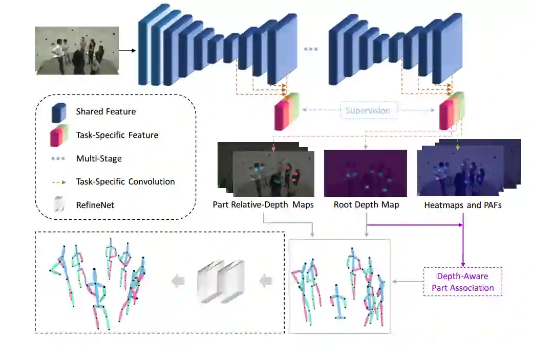 上图展示了所提出方法的流程,包括 SMAP 网络,基于深度的关键点匹配(Depth-Aware Part Association), 和可选的微型优化网络(RefineNet)。输入一张彩色图像,SMAP 网络同时输出人体根节点深度图(Root Depth Map)、二维关键点热度图(Heatmaps)、关键点连接向量场(PAFs)和骨骼相对深度图(Part Relative-Depth Maps)。基于以上的 2.5D 特征表示方法,进行关键点匹配,然后利用相机模型得到人体绝对三维关键点坐标。最后,可以使用微型优化网络对结果进行补全和优化。