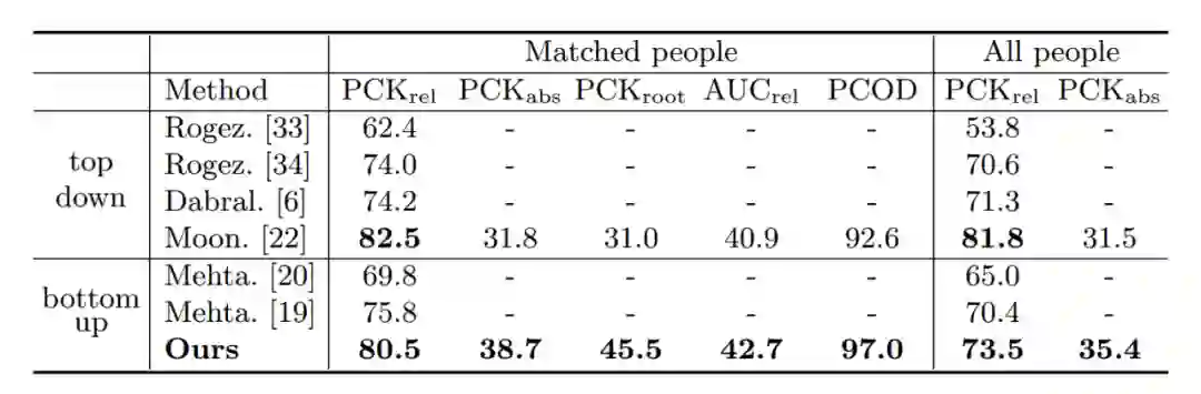 综上,我们提出了新的单步自底向上的方法估计多人场景的人体绝对三维姿态,它可以在一次网络推理后得到所有人的绝对位置信息和三维姿态信息。另外,我们还提出了基于深度信息的人体关键点匹配算法,包括深度优先匹配和自适应骨长约束,进一步优化关键点的匹配结果。