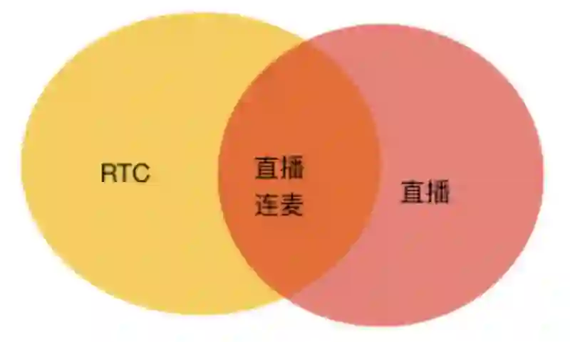 上图展现的就是 RTC 与直播的关系,RTC 的一个具体应用是直播场景中的直播连麦,也就是低延时直播。普通直播,一般采用 TCP 协议,使用 CDN 进行内容分发,会有几秒甚至十几秒的延时,主播和观众的互动只能通过文字短消息或送礼来进行。而直播连麦,使用 UDP 协议,内容实时传输,主播和观众可以进行音视频连麦互动,实时沟通,延时一般低至几百毫秒。