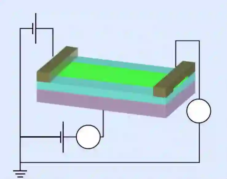 图1 一种场效应晶体管,由高掺杂硅衬底(粉红色)上的二维半导体MoTe2(绿色)制成。衬底是晶体管的栅电极,二氧化硅表面层是栅极介电质。金属电极(棕色)用作源电极和漏电极。V和I 是电压和电流