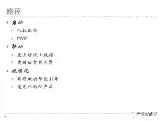 最后再总结一下,对于AI来说,首先启动会以人机结合的方式,不需要等到技术完全成熟也能有效的使用起来。然后是把产品深入做下去,慢慢地积累更多的数据,拥有更好的引擎,最后它将会是一个规模化的东西,这就是我看到的商业路径。