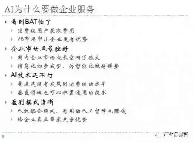 简单加以总结,便是如下四点:C端看到BAT怕了、企业市场风景独好、AI在C端的不成熟性与企业服务中盈利模式的清晰性