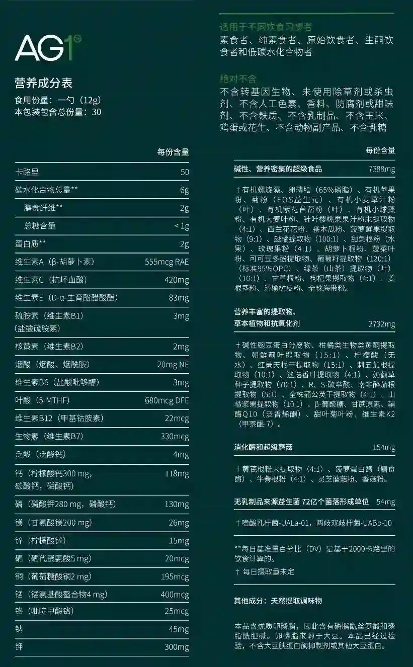 一些主打营养组合的营养补充剂则解决了这些痛点。以一款最近风口正盛的AG1小绿粉为例。AG1小绿粉是从众多营养补充剂品牌中杀出的一匹黑马——AG的主打产品。