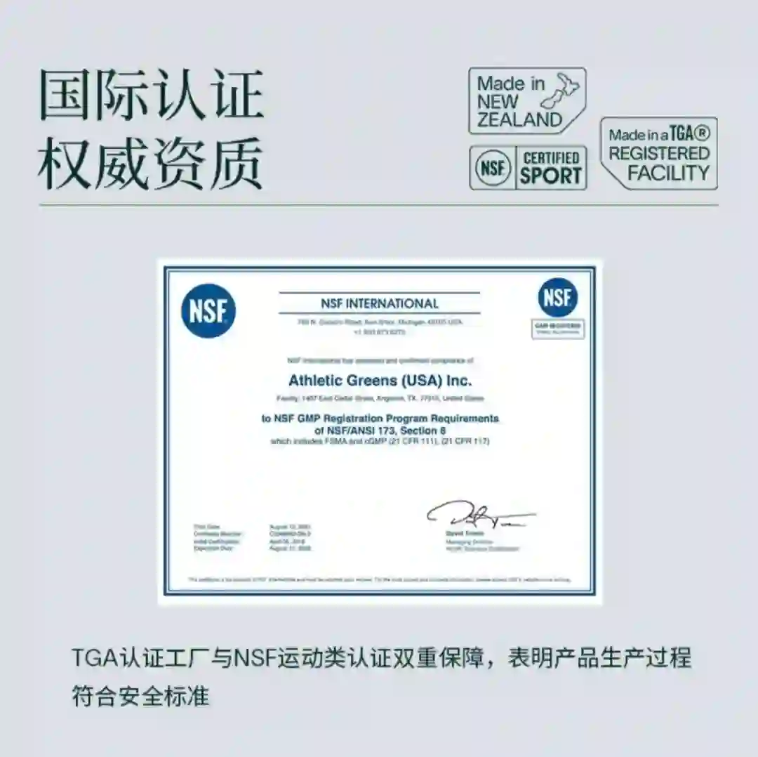 AG还拿到NSF(美国国家卫生基金会)的认证,这是一个职业运动级别产品的饮品认证,这也意味着其产品是符合职业运动级别的。
