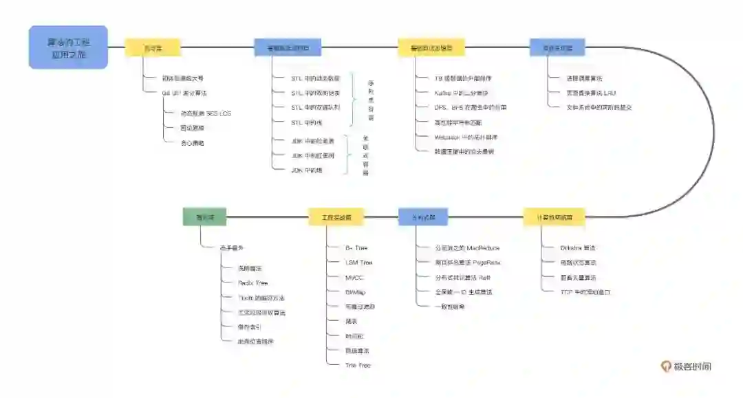网上资料不少,大多讲的理论,不结合实际问题,不考虑工作场景,还是学不会。最近看到极客时间上了个《算法实战高手课》专栏,还是让我眼前一亮的,点题就是「实战」,我第一时间就订阅了,看了更新的几篇,可以说是从实际工程问题的视角,真真切切的为大家呈现了一堂实用的算法课,分享一张专栏中「核心算法应用图」。