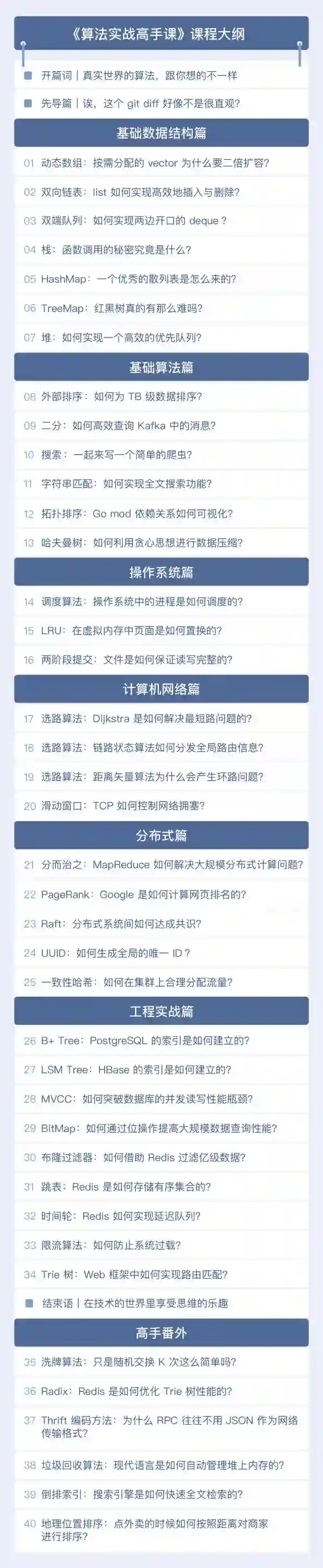 专栏主题是真实世界的算法、工程中的算法。主要分为基础和实战两部分,共 6 个篇章: