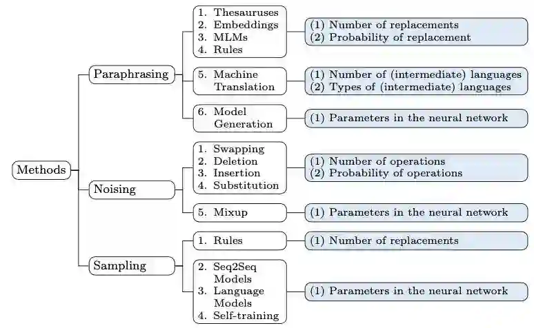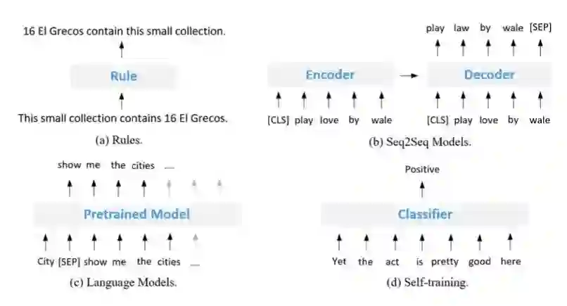 Sampling是指从数据分布中采样出新的样本,不同于较通用的paraphrasing,采样更依赖任务,需要在保证数据可靠性的同时增加更多多样性,比前两个数据增强方法更难。作者整理了4种方法: